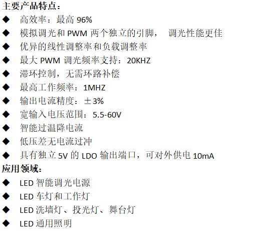 具有專利電路架構(gòu),使得低壓差下無輸出電流過沖現(xiàn)象,提高了LED的壽命。