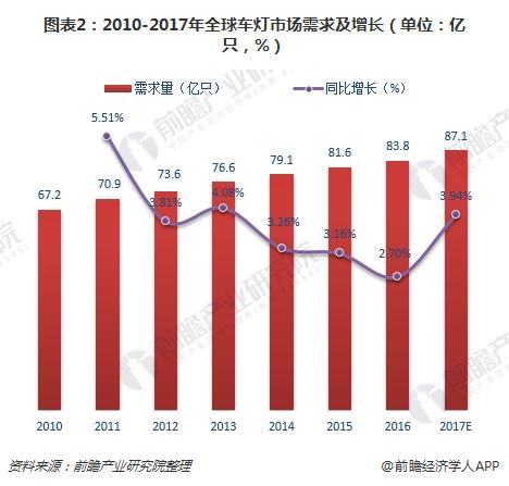 近年來,隨著全球汽車消費持續(xù)增長,車燈行業(yè)需求同樣穩(wěn)步提升。數(shù)據(jù)顯示,2016年,全球車燈市場需求量已達83.8億只,同比微增2.70%。經(jīng)測算,2017年全球需求量約為87.1億只。