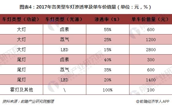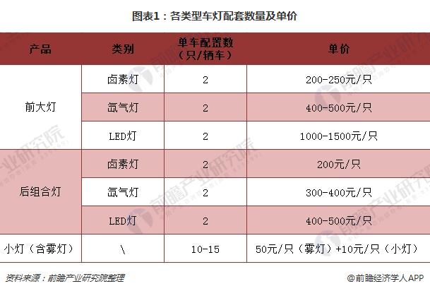目前,一輛汽車中,前大燈會配置2個鹵素燈、2個氙氣燈、2個LED燈,后組合燈同樣是鹵素燈、氙氣燈、LED燈各2個,但后組合燈的氙氣燈、LED燈單價會更便宜;小燈(含霧燈)會配置10-15個。